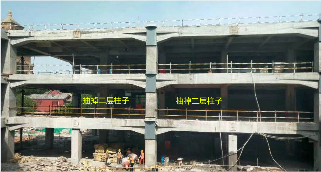 該項(xiàng)目難點(diǎn)在于托梁抽柱技術(shù)復(fù)雜,施工難度大,且工期緊,我公司在技術(shù)上大膽創(chuàng)新,優(yōu)化施工方法,在垂直方向上同一位置同時(shí)拔掉3根柱子。